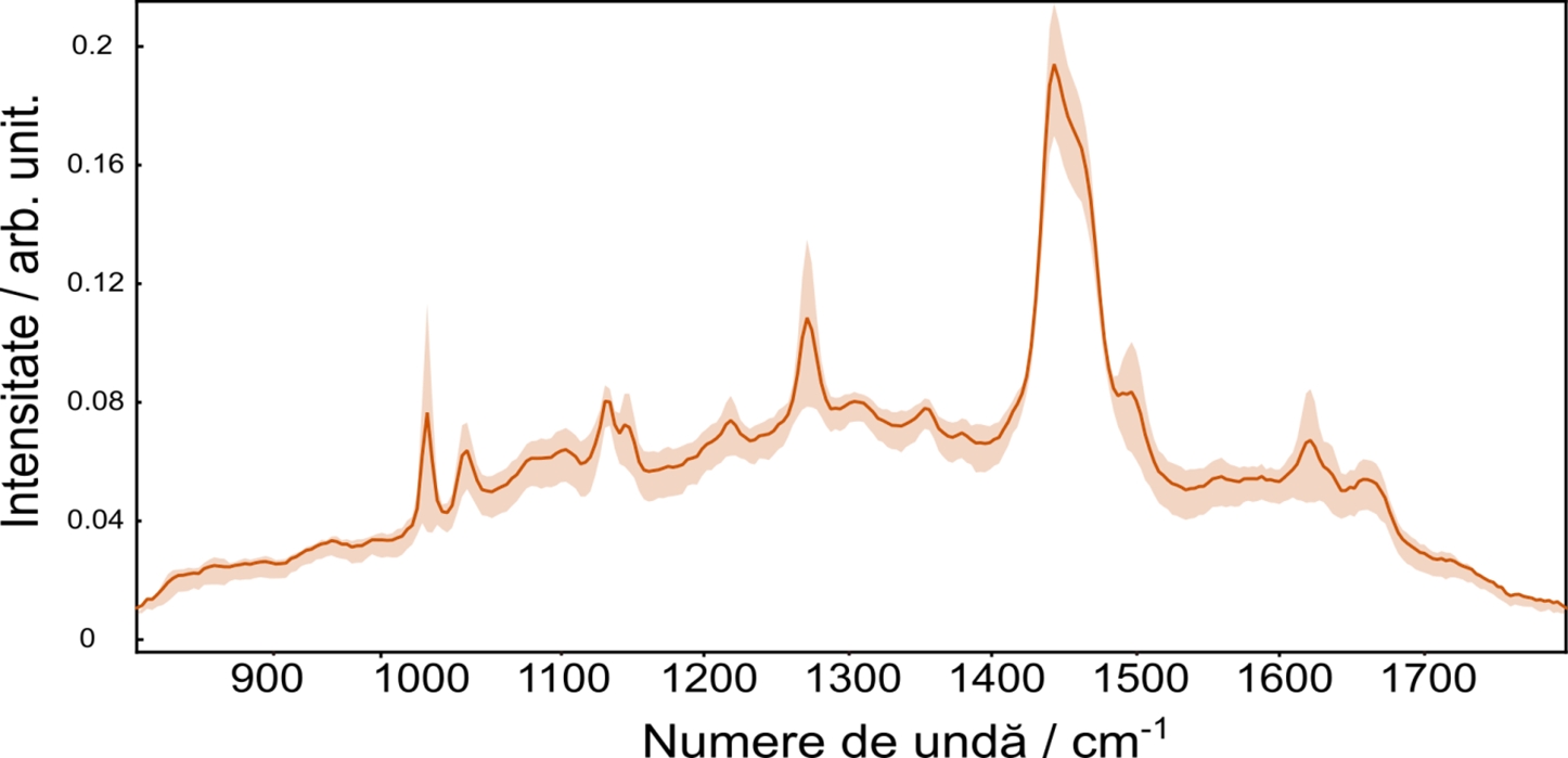 Figura 2. Spectre SERS a probelor de plasmă înregistrate și analizate cu demonstratorul experimental în vederea clasificării probelor în clasele diabetic, prediabetic și sănătos precum și pentru predicția concentrațiilor de albumină glicată.